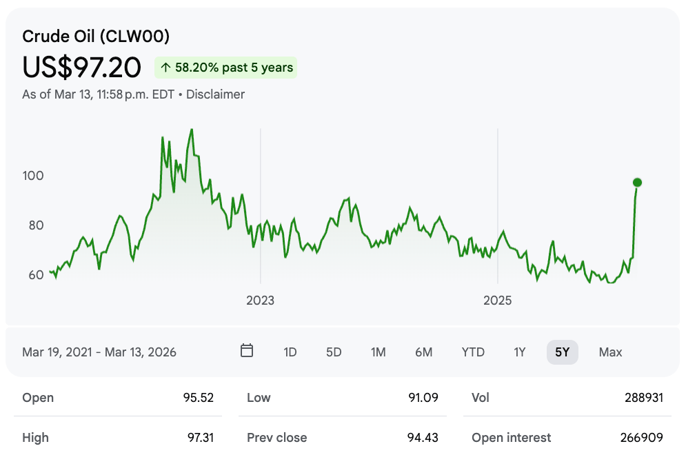 West Texas Intermediate crude, the US benchmark, has risen approximately 41% since the airstrikes on Iran began, to nearly $95 a barrel. At its peak, Brent crude surpassed $126 per barrel, a level not seen in years.
